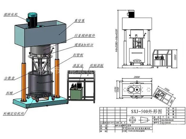 工作原理: 雙行星分散混合機有高速、低速、活動刮板作攪拌、剪切、刮壁、溶解用。低速運轉的攪拌錨使物料在密閉容器內上下翻動、剪切和混合,高速運轉的齒形分散盤與混合的物料產生強烈的碰擊和剪切,隨著攪拌錨的旋轉,行星架上的活動刮刀隨著旋轉,把釜體上的物料完全刮掉,使聚集物完全、徹底地達到混合、分散、溶解的要求。在其高低速的不同作用下,使物料能夠達到均勻的混合和分散。